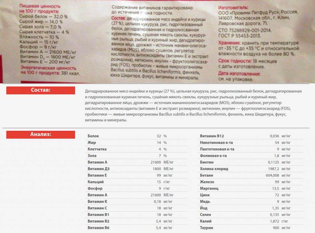 На первое место изготовитель поставил птичье мясо. Из какого сырья изготовлен гидролизированный белок, непонятно, однако усвояемость аминокислот из переработанного продукта почти стопроцентная. В кормосмесь входит метионин – материал для формирования шерстинок.