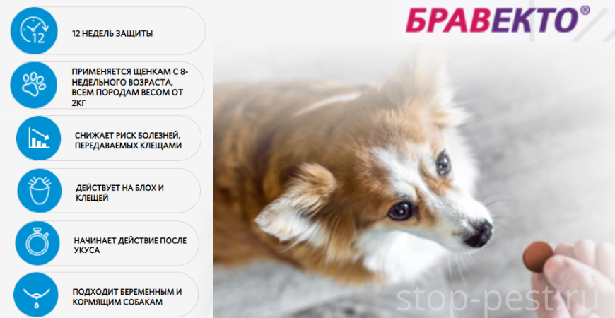 Блохи и клещи поражаются флураланером уже в первые 4 часа, около 97-98% уничтожается через 8 часов после применения «Бравекто». Через 12 часов они полностью погибают, не оставляя яиц и личинок. Как только препарат начинает действовать, эктопаразиты теряют возможность прикрепляться к коже собаки, получать питание, также терпит фиаско их иммунная система, поэтому даже через время эктопаразиты не смогут паразитировать на теле собаки, они просто погибнут.