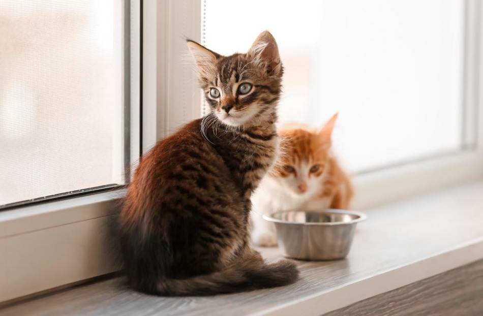 Если в доме есть другие животные, миски ставят на возвышение (тумбочку, подоконник). Котенок не должен испытывать стресс во время еды.