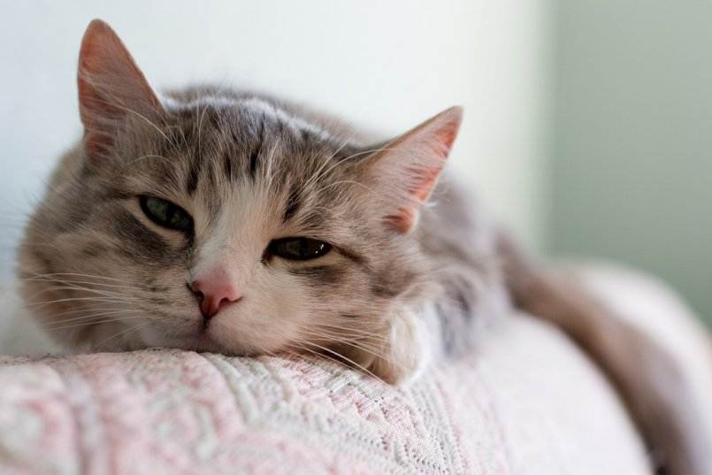 - вялость, угнетенное состояние – кошка неактивна, старается больше лежать, при этом долго выбирает место для сна и положение тела);