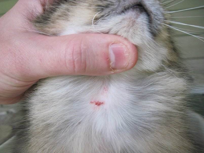 Чтобы исключить возможность расчесывания и, соответственно, травмирования кожного покрова, целесообразно использование медицинской повязки или защитного воротника, которые следует зафиксировать на шее кота.