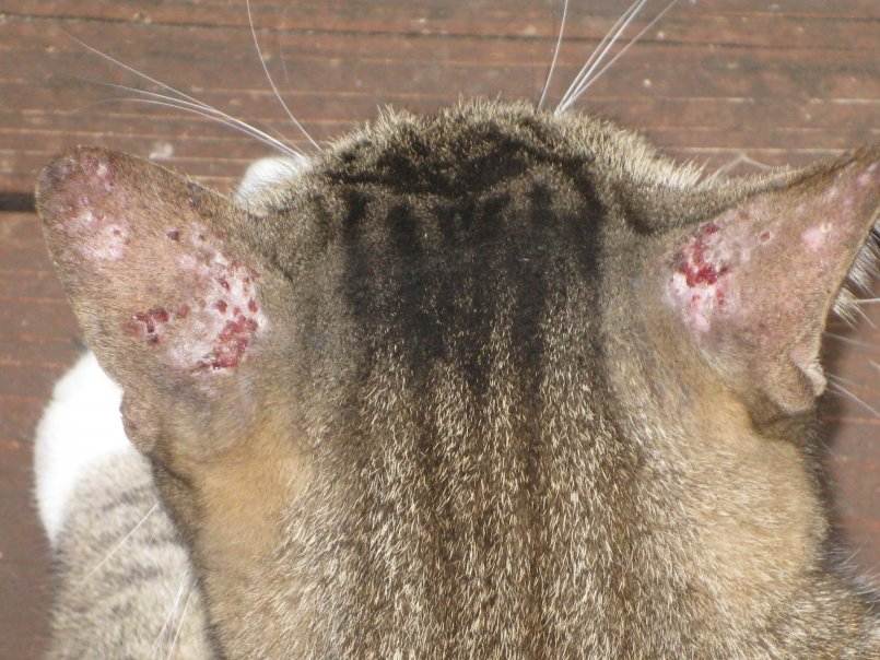 Другое название этого заболевания — миллиарный дерматит у кошек. Главный признак — покраснение и сыпь на пораженных участках тела в виде узелков, папул, пузырьков, везикул.