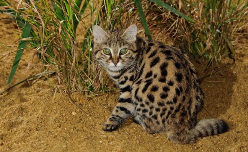 У дикой африканской кошки довольно мелкое телосложение. Отдаленно они могут напоминать леопарда, но только в миниатюре. В действительности, самки черноногих кошек в длину достигают отметки в 40 см, при этом длина их хвоста может приравниваться к половине размеров туловища. В среднем, вес такой кошки составляет порядка 1,5 кг, что в разы меньше, чем у их одомашненных сородичей. Этому способствует неустанный темп жизни хищников, которые должны быть достаточно легкими, чтобы развивать большую скорость и добывать себе пропитание, в то время как домашние любимцы не нуждаются в этом.