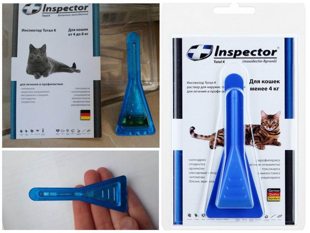 Один из вариантов выпуска этого лекарственного средства предназначается кошкам, другой — собакам. Препаратом для лечения котов от блох и клещей являетсяИнспектор Тотал К, буква же C на маркировке, говорит о том, что это лекарство для собак.