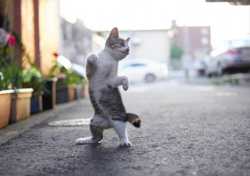 Суть команды состоит в том, чтобы кот становился на задние лапы по желанию хозяина. Для этого коту дают лакомство с ладони, каждый раз поднимая ее все выше – так, чтобы ему пришлось оторвать передние конечности от пола и попытаться достать угощение. После того как упражнение начало хорошо получаться, можно научить питомца ходить и кружится на задних лапах, как бы танцуя. Это достигается путем перемещения высоко расположенного лакомства.