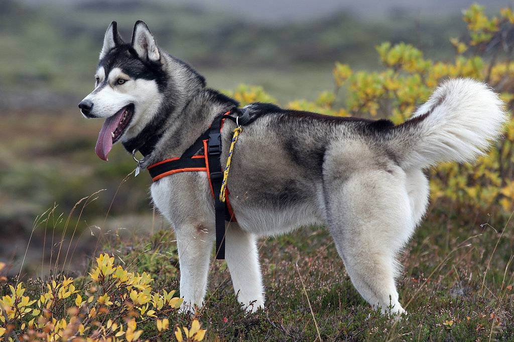 В середине девятнадцатого века выносливых псов завезли на Аляску, где они скрещивались с местными породами. В результате получилась собака среднего размера с гармоничным сложением, густой шерстью и закрученным вверх пушистым хвостом. Согласно стандарту породы, зафиксированному в 30-х годах двадцатого века, хаски должна иметь:
