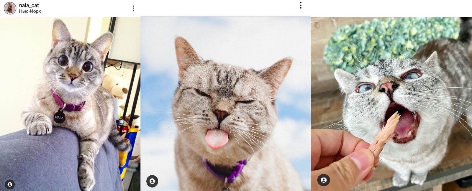 История восхождения четвероногой Налы @nala_cat с необычными выразительными глазами началась, когда её забрали из приюта в любящую семью. А дальше понеслось: страничка в соцсети, забавные фотографии, миллионы поклонников по всему миру, отметка в Книге рекордов Гиннесса, шоу на Facebook, продукция под собственной маркой и книга. Сейчас у Налы 4,3 млн подписчиков в Инстаграме.