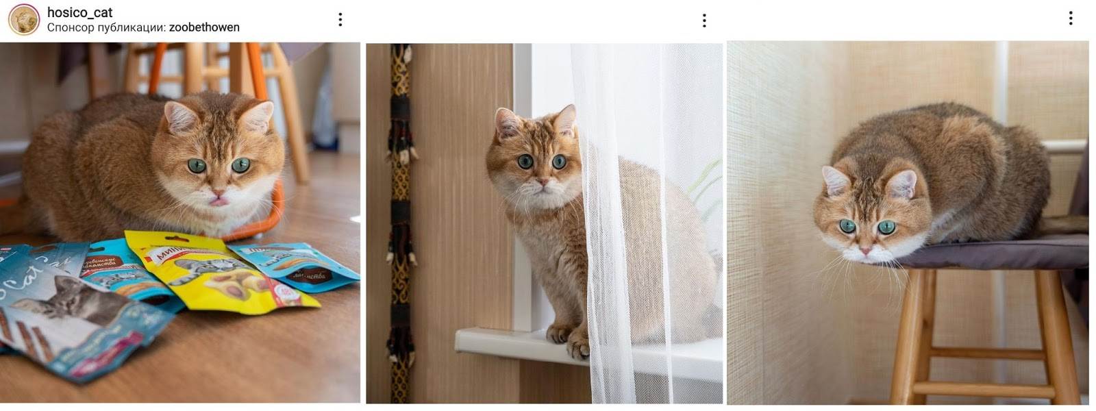 Забавными фото и видео рыжего пухляша Хосико @hosico_cat из Москвы любуются больше миллиона подписчиков. В своем аккаунте котоблогер рекламирует кошачьи лакомства, лежанки, игры и разные интересные приспособления для своих собратьев. У Хосико есть много фан-страничек, которые создали его поклонники.