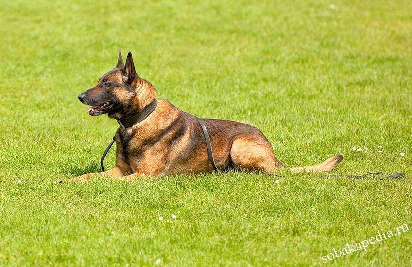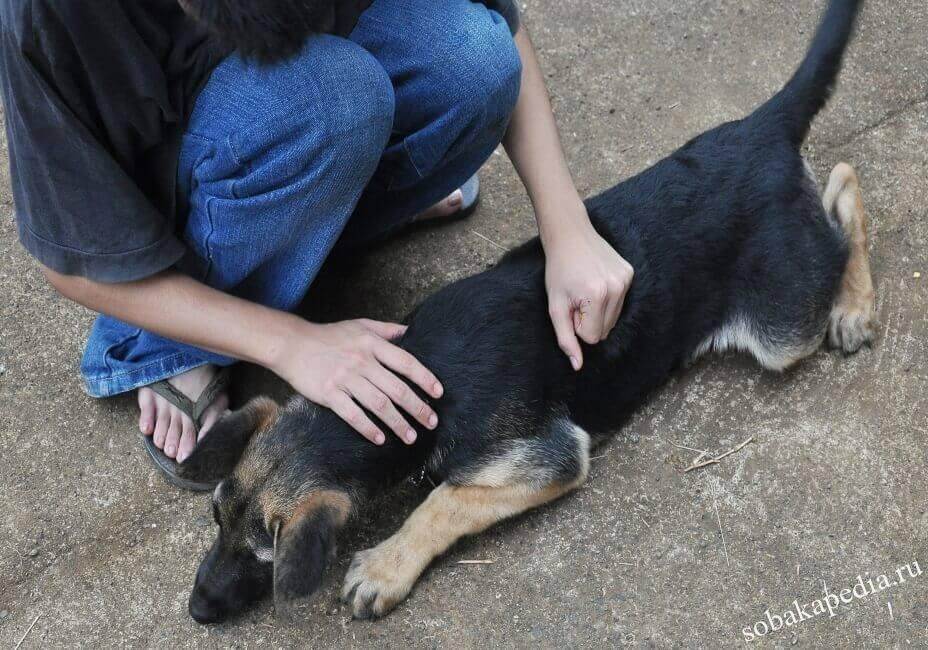 Если четвероногий друг не реагирует на лакомство в вашей руке, тогда остается только усмирительный метод, когда дрессировщик дергает поводок вниз и надавливает на холку животного, побуждая его лечь. После окончания необходимых действий следует произнести команду «лежать».