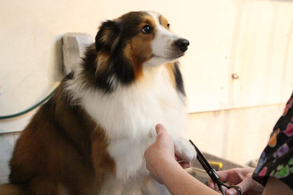 - Нужно внимательно осмотреть лапы пса, если между пальцами растет шерсть, ее следует предварительно состричь ножницами с закругленными кончиками, чтобы освободить доступ к ногтям. Кроме того, эти лишние волоски являются местом скопления грязи, поэтому удаление шерсти с подушечек лап снизит вероятность занесения инфекции.