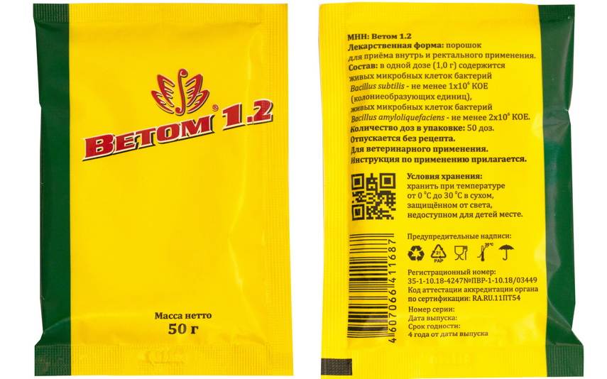 Согласно инструкции по ветеринарному применению, препарат расфасован в пакеты из ламинированной бумаги или полимерных водонепроницаемых материалов или в банки полимерные: