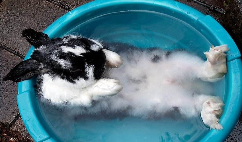 Поскольку в природе у кроликов водные процедуры отсутствуют, купать их в ванночке не рекомендуют. Слипшиеся участки шерсти протирают влажной тряпкой или гигиенической салфеткой, а затем наносят специальный кондиционер для звериной шерсти. Однако, некоторые кролики просто обожают нежиться в теплой водичке и не против перетерпеть мыльный массаж от хозяев.