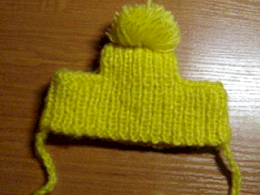 На одной из них 10 петель и на двух спицах, с тыльной стороны шапочки по 7 петель. Вяжем ушко белыми нитками со стороны мордочки и в цвет шапочки с тыльной стороны. Во время вязания убавляем по одной петле в начале ряда. На концах ушек пришиваем белые кисточки.