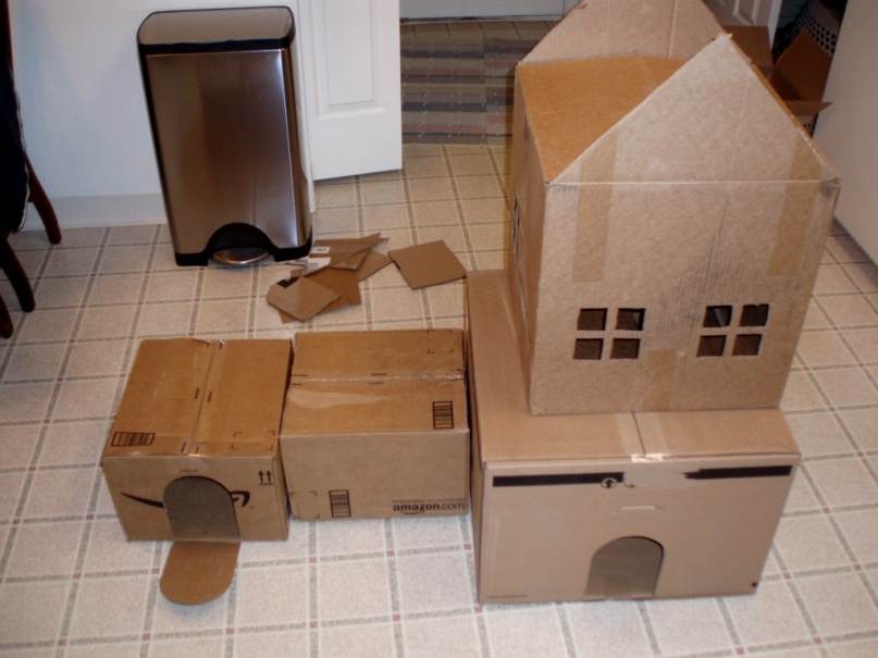 Конечно, можно не ломать себе особо голову и сделать домик можно и из картонной коробки, вырезав в ней отверстия для дверей и окошек и бросив на ее дно подстилку. Склеив между собой несколько коробок, можно получить жилище из нескольких комнат и даже многоэтажный домик.