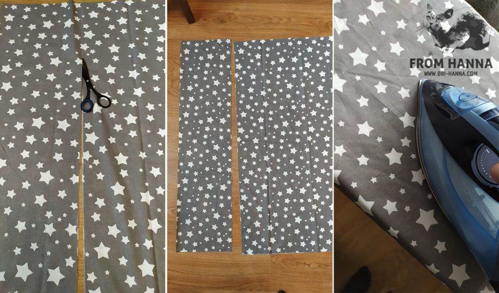 Получившийся шаблон накладывают поверх ткани и прихватывают булавками, чтобы ткань не съехала в сторону, а затем аккуратно вырезают по контуру основу будущего изделия. Всего таких заготовок потребуется 4.