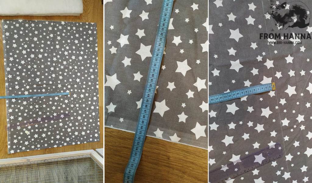 Сложить ткань лицом внутрь, уложить на листовой синтепон плотность 300 (в 1 или 2 слоя). Прикрепить ткань к синтепону булавками. Обрезать синтепон с припуском 2 см от ткани