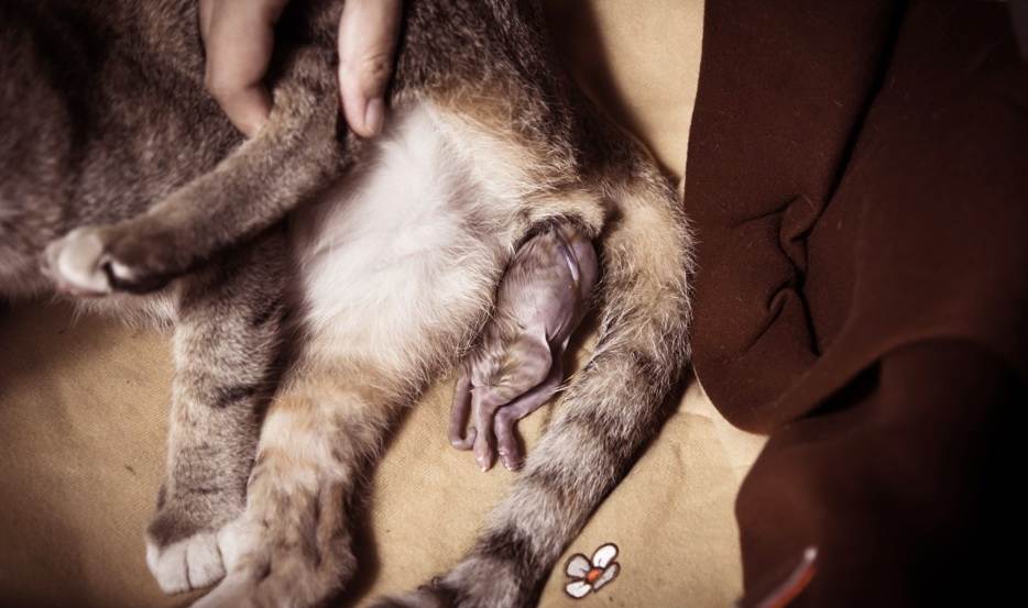 Выход котенка. Он может появиться в пузыре или без него, если пленка лопнула при продвижении по родовым путям. В норме сначала появляется голова, затем рождается остальная часть тела.