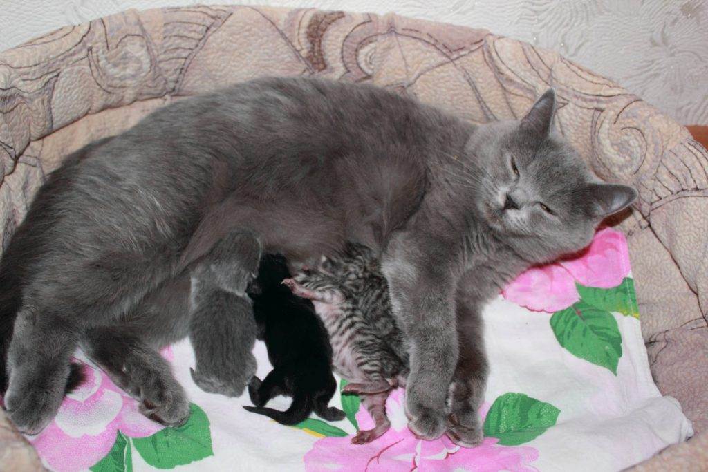 Кормление потомства. Сразу после появления на свет котята присасываются к груди матери. При этом роды могут продолжаться, пока не выйдут все малыши.