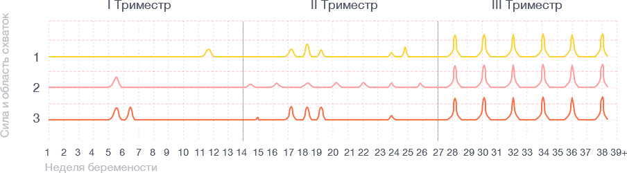 Периодичность и локализация тренировочных схваток второго и начала третьего триместра, предвестниковых схваток, родовых схваток. Пример.