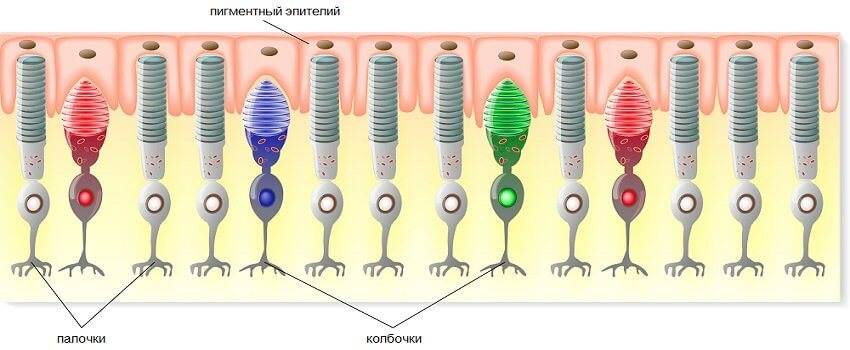 - колбочки – отвечают за четкость картинки, способность видеть мелкие детали и восприятие цвета.