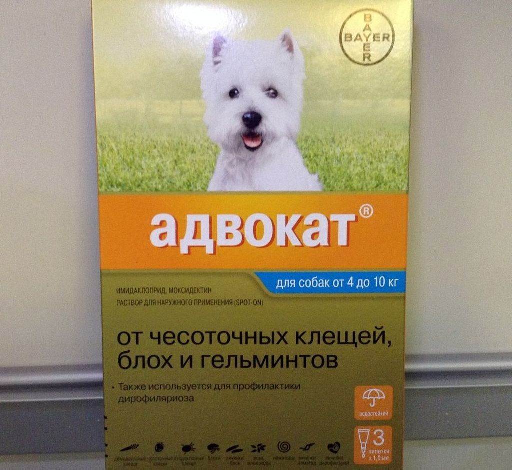 Адвокат – комбинированный противопаразитарный лекарственный препарат. В 1 мл препарата содержится имидаклоприд – 100 мг и моксидектин – 25 мг. Адвокат выпускается в виде капель на холку в четырех дозировках – для щенков и собак до 4 кг, для собак 4–10кг, для собак 10–25кг и для собак более 25кг. (Германия).