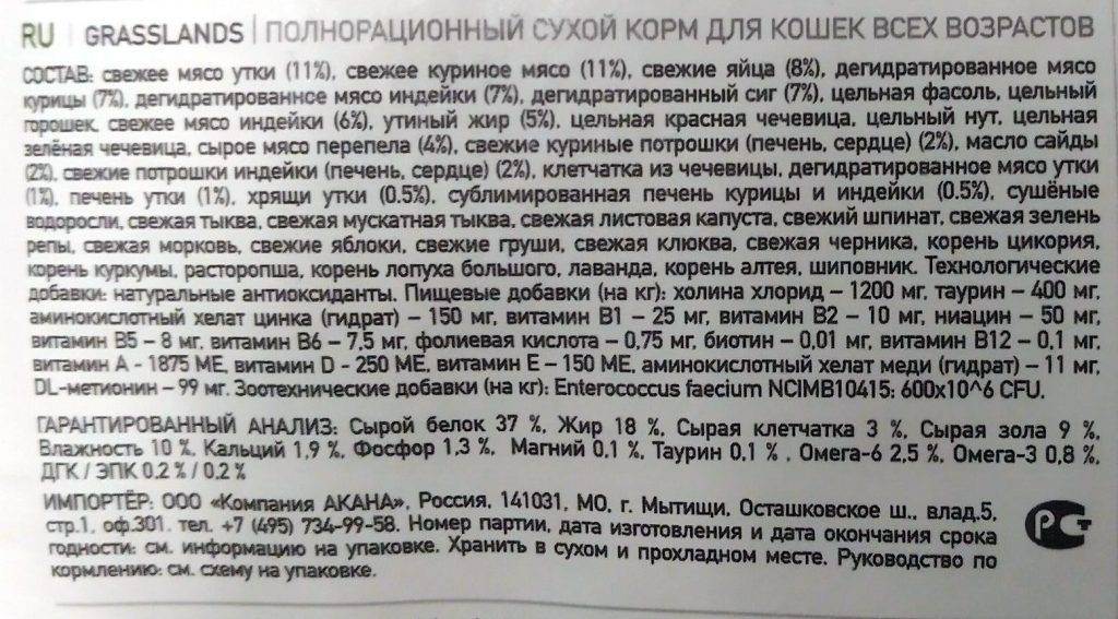 Рассмотрим состав корма Acana на примере варианта Grasslands (для кошек всех возрастов):