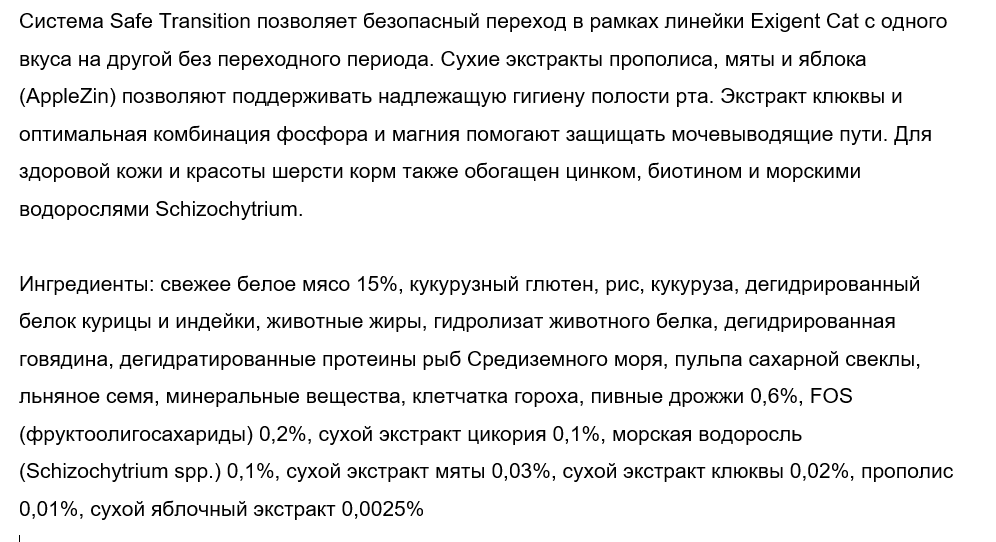 Помимо мясных продуктов кормосмесь содержит экстракты прополиса, яблока, перечной мяты. Содержание протеина – 35,5%; жира – 17,5%; клетчатки – 1,9%. Питание выпускают упаковками по 0,3; 1,5 кг стоимостью 271; 1159 руб.