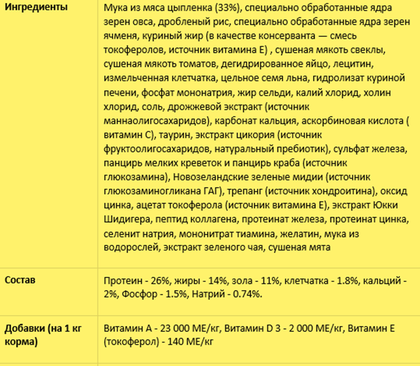 | Среди ингредиентов нет свинины, сои, пшеницы и кукурузы, плохо усваиваемых организмом животных. | Невысокое содержание белка животного происхождения и большое содержание жира. |
