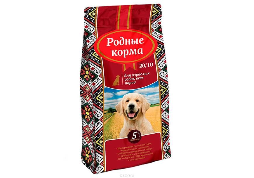 Для анализа возьмем рацион из линейки «Родных кормов», предназначенный для взрослых собак всех пород (20/10). В составе: