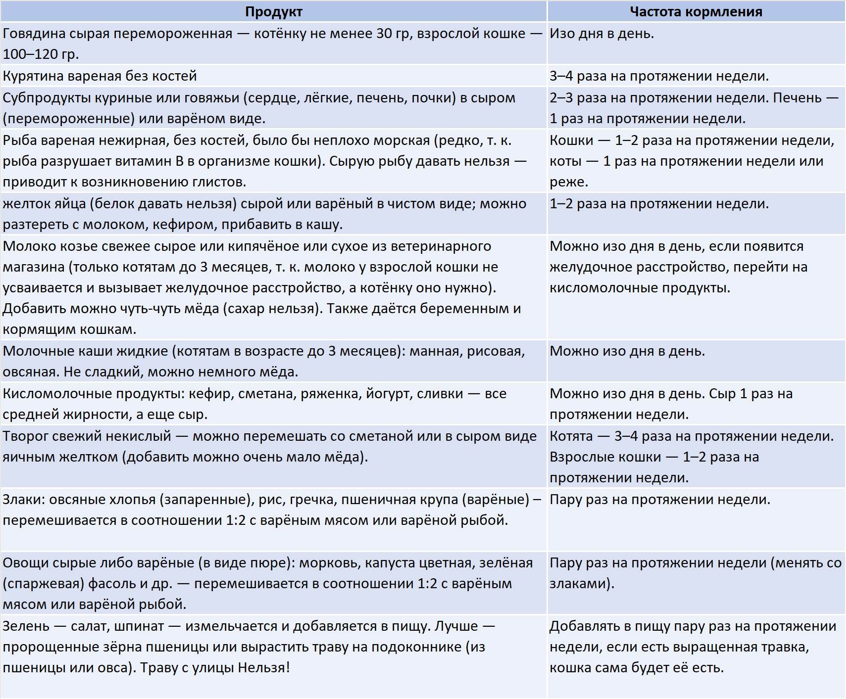 Кроме этого, кошка должна иметь постоянный неограниченный доступ к чистой питьевой воде. Если кошка находится на готовом сухом корме, количество воды должно в три раза больше массы съеденного корма. Подробные советы по рациону представлены в таблице ниже.