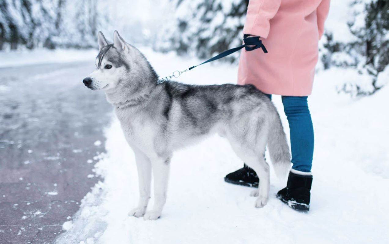 Хаски зимой на прогулке на поводке у девушки