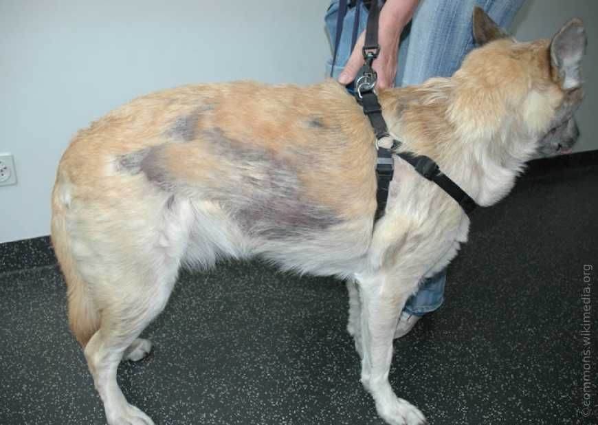 При хроническом течении заболевания кожа животного начинает тускнеть, усиливается выпадение шерсти.