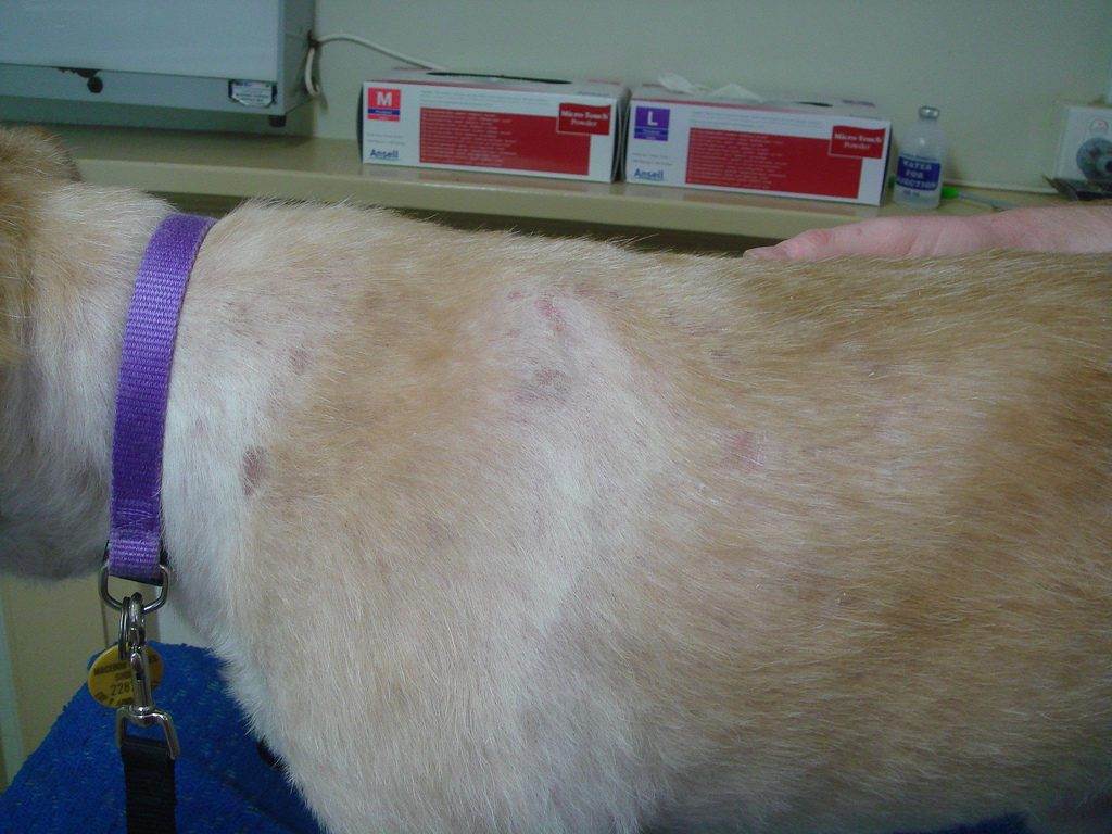 Пятна пораженной кожа на спине и корпусе, чаще всего, возникают при отрубевидном, розовом и мокнущем решение. Отметим, что поражение на корпусе, образовавшиеся вследствие грибковой активности, не так опасны, как пятна на морде и слизистых оболочках. Обычно ситуацию удаётся купировать регулярной обработкой противогрибковыми мазями и диетой.