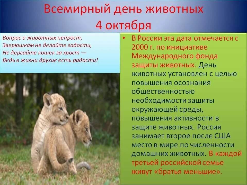 Когда празднуют День животных в России? В нашей стране праздничная дата совпадает с международной, праздник приходится на 4 октября.