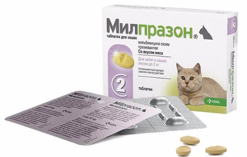 - Милпразон для котят и кошек весом до 2 кг. В 1 таблетке содержится 4 мг мильбемицина оксима и 10 мг празиквантела;