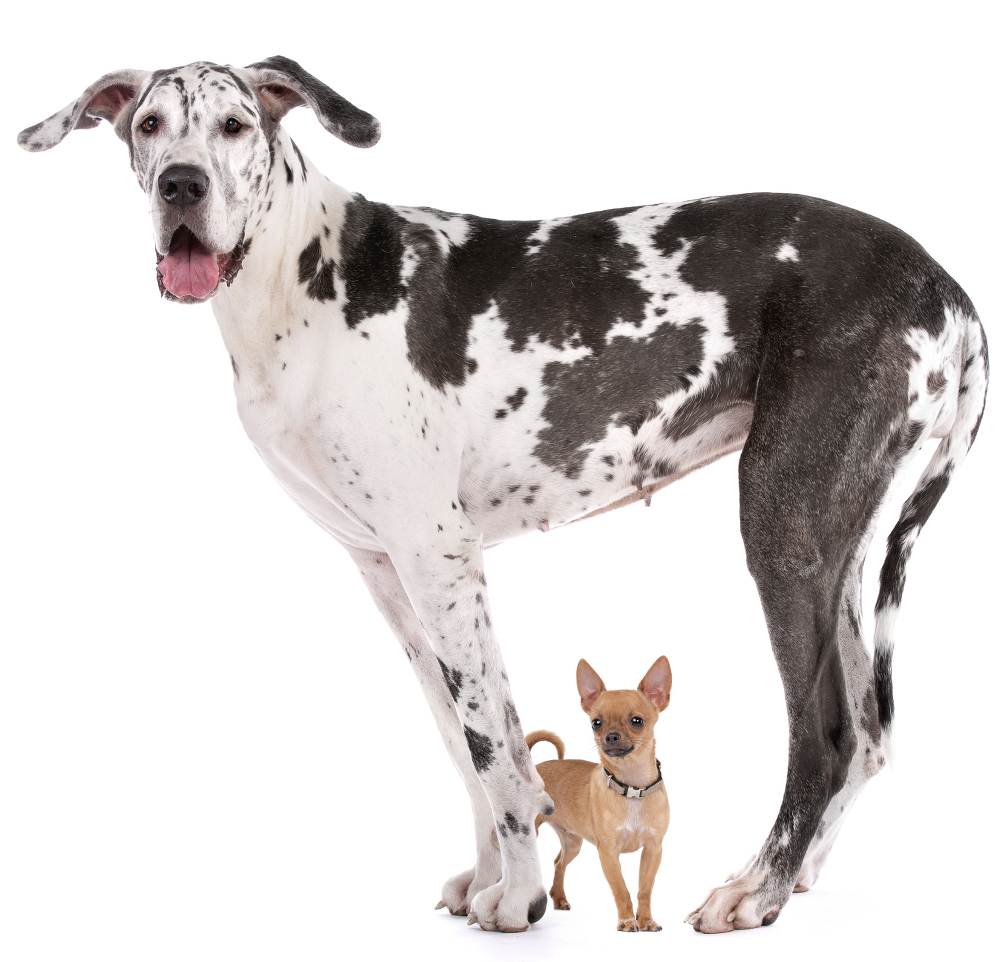 Размер питомца весьма внушительный: рост около 80 см., вес около 90 кг. Представителей с белой окраской и черными пятнами называют также долматинскими догами.