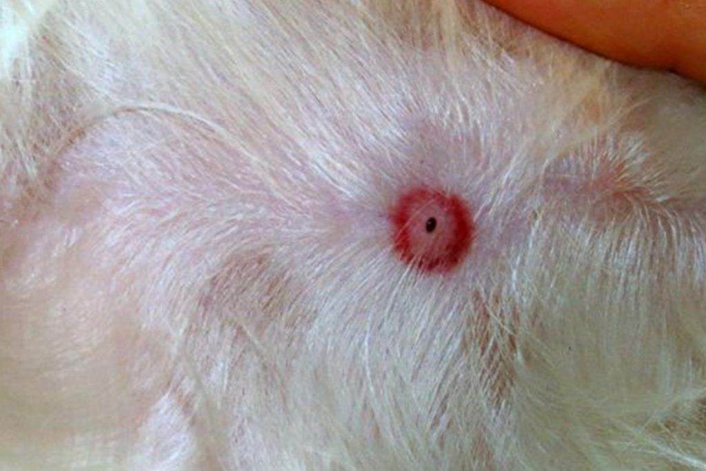 После избавления питомца от кровососущего паразита и дезинфекции ранки следует еще раз внимательно осмотреть кожу животного в месте укуса. Как правило, оторванная голова клеща заметна в виде черной точки на красном фоне.