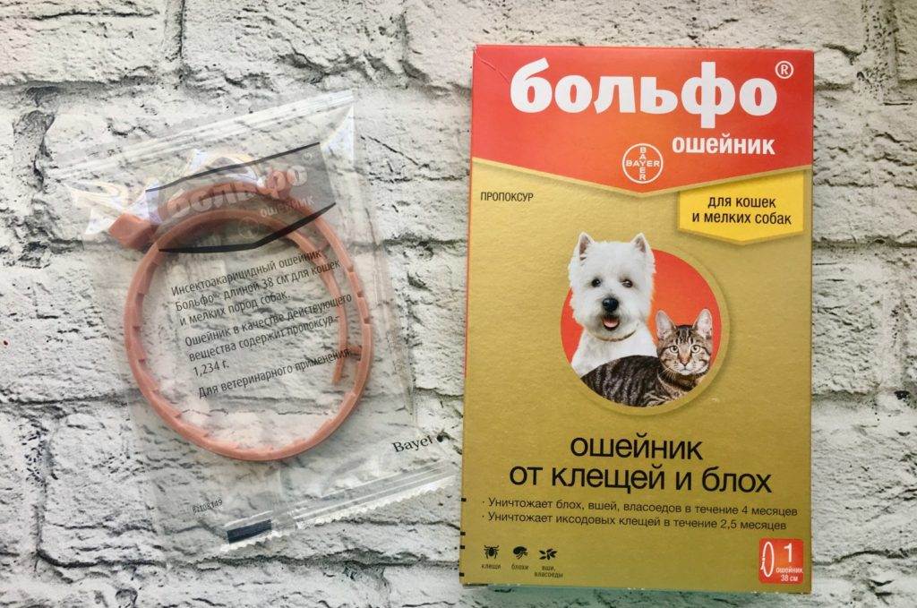 Больфо. Еще один влагостойкий ошейник, но срок его действия намного меньше. Против блох он активен в течение 4 месяцев, а против клещей – в течение 3. При длительном дачном сезоне рекомендуется хотя бы один раз сменить аксессуар. Действующее вещество – пропоксур. Выпускаются ошейники разных размеров, подбираются в зависимости от веса животного. Стоимость – около 500–600 руб.
