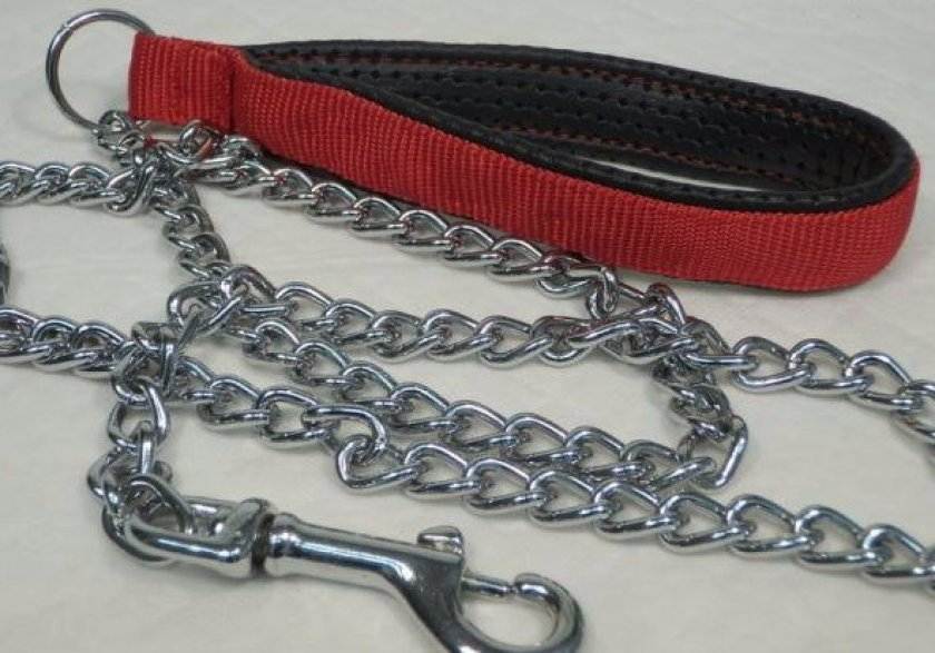 Цепочка – состоит из металлической цепи и ручки. Поводок-цепочка характеризуется привлекательным видом и высокой прочностью. Этот поводок собака не перегрызет. Недостатки цепочки: большой вес, вероятность отсоединения звеньев при рывке крупного и сильного животного.
