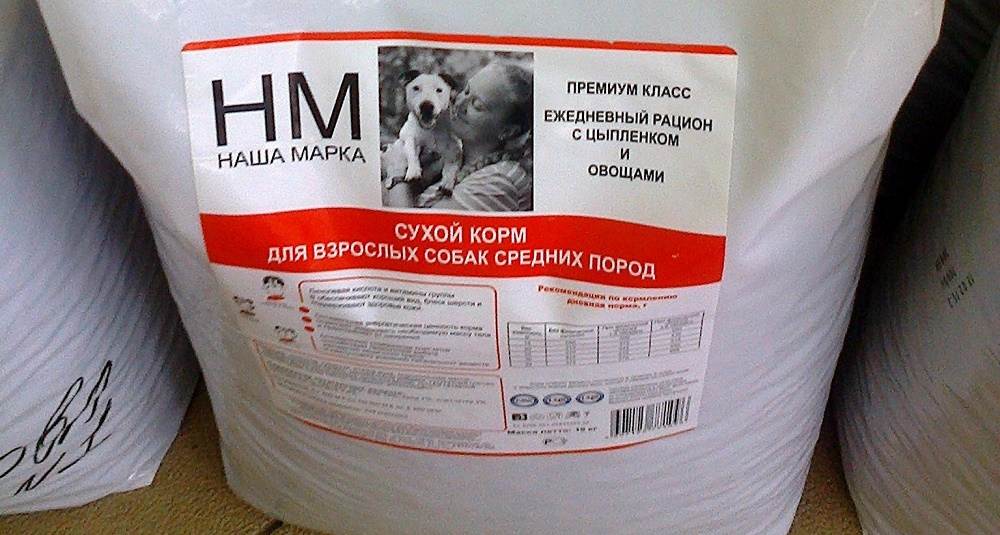 «Наша марка» – российская компания, производитель тщательно подходит к подбору добавок и компонентов. В составе заявлено от 18 до 25% белка в зависимости от самого корма. Однако, в составе мясная мука указана только на 2-3 месте, а на первых двух кукуруза и пшеница соответственно. Оценки покупателей колеблются между 3 и 4. Очень многие отмечают, что корм с трудом можно отнести к категории «премиум», хотя многие собаки едят его с удовольствием. У большинства он не провоцирует проблем со здоровьем, но к гипоаллергенной линейке есть много претензий. Часть покупателей выбирает его из-за ценовой политики. Цена: от 490 рублей за 3 кг.