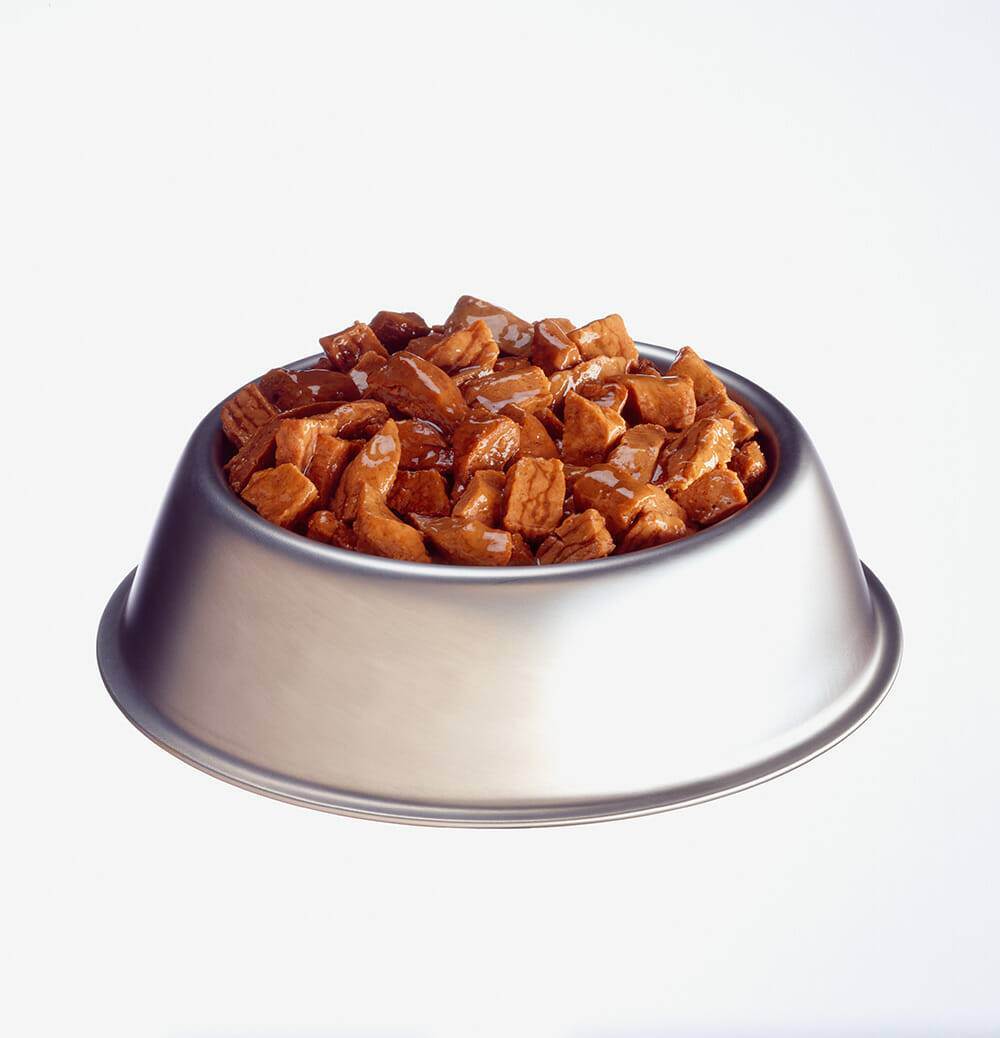 Мокрые мясные кусочки снижают вероятность развития мочекаменной болезни, так как питомец получает дополнительный объем жидкости. Они легче усваиваются, и можно подобрать марки для питомцев с чувствительным пищеварением, аллергией, ожирением и другими проблемами.