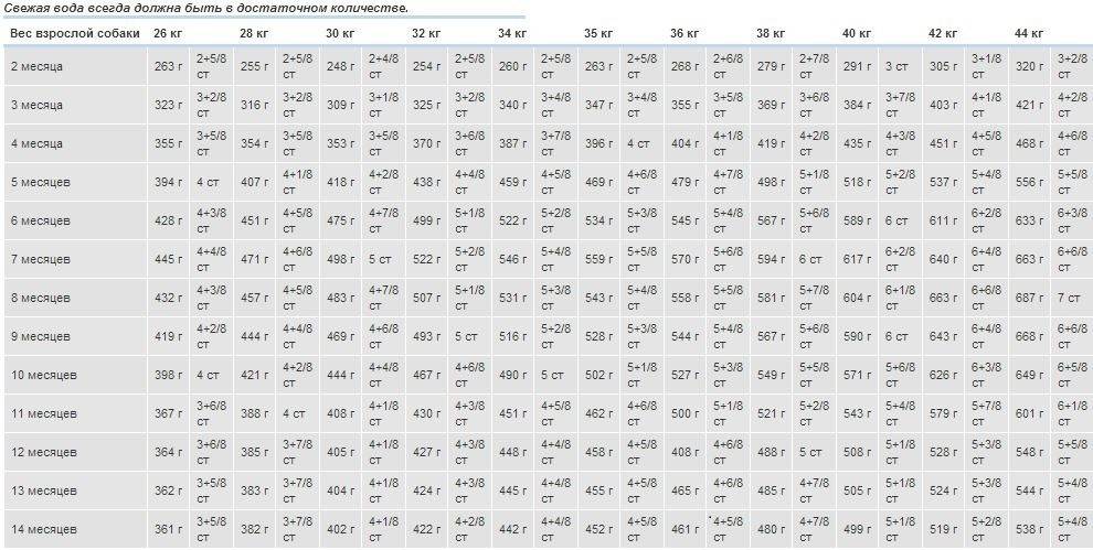 Щенкам средних пород нужно 450–600 г в сутки, а представителям крупных пород — 630–910 г.