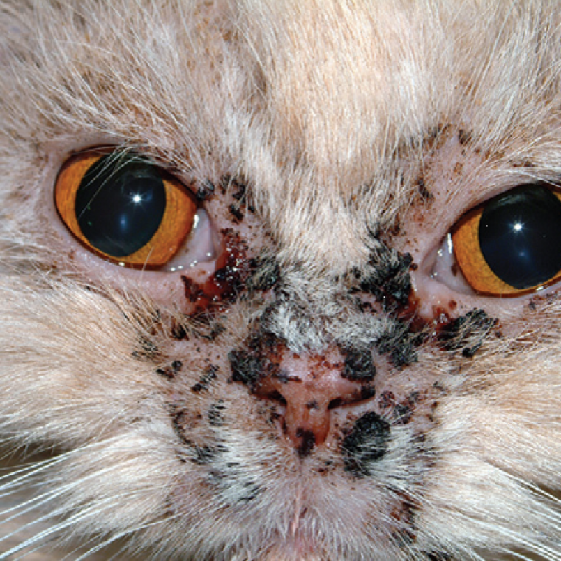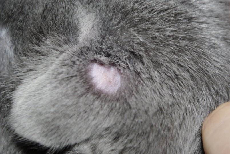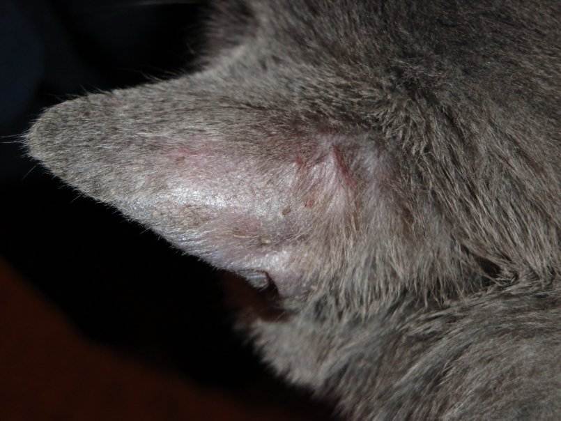 Первоначальные скутулы мягкие, но затем подсыхают, становятся серыми, зернистыми, осыпаются, обнажая участки кожи с выпавшими волосами. Если заболевание вызвано возбудителем парши, кошка не ощущает нестерпимого зуда, характерного для лишая и бактериальных поражений кожи.