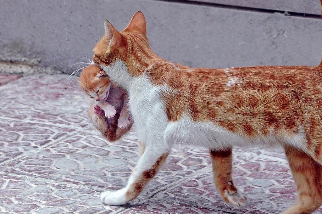 Кошки перетаскивают котят, прикусив зубами за шкирку