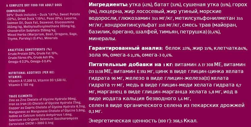 Источниками белка в корме выступают: утка 41%, сушенная утка 15%. Других очень богатых белком ингредиентов нет, поэтому можно быть уверенным что основная часть из указанных в анализе 23% протеина — животного происхождения (богаче по аминокислотному составу и лучше усваивается чем растительные белки).