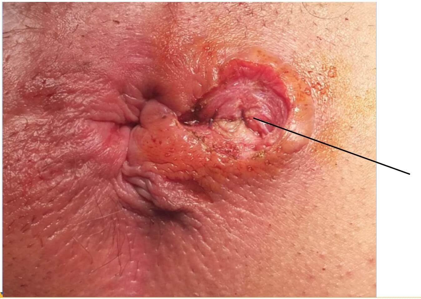 - наличие небольшой малоболезненной раны – наружного свищевого отверстия на коже промежности или ягодиц.