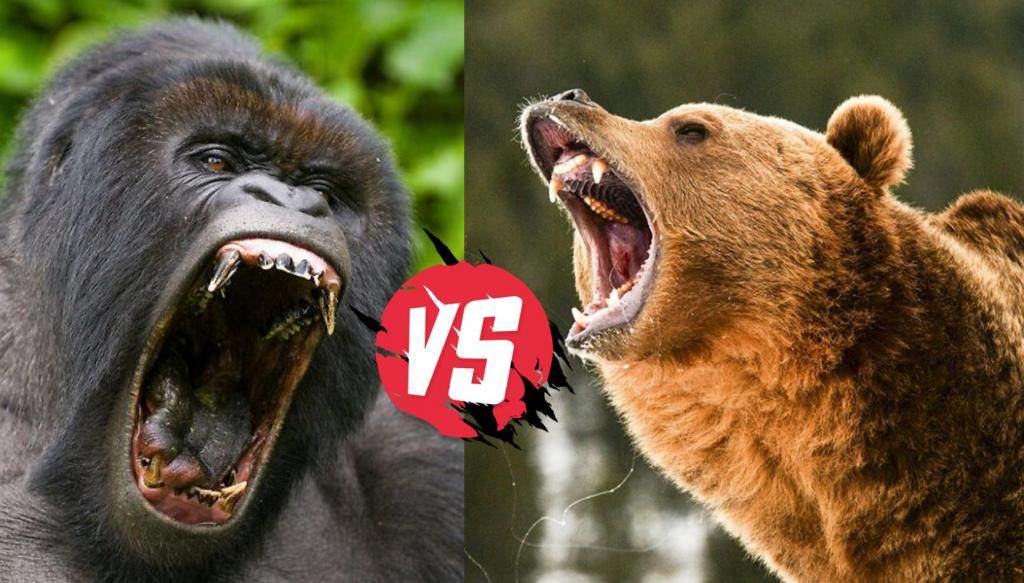 Исход битвы зависит от того, кто нанесет удар первым. Медведь, скорее всего, мог бы убить гориллу за одну атаку. Но у гориллы хватает сил разорвать пасть медведя.