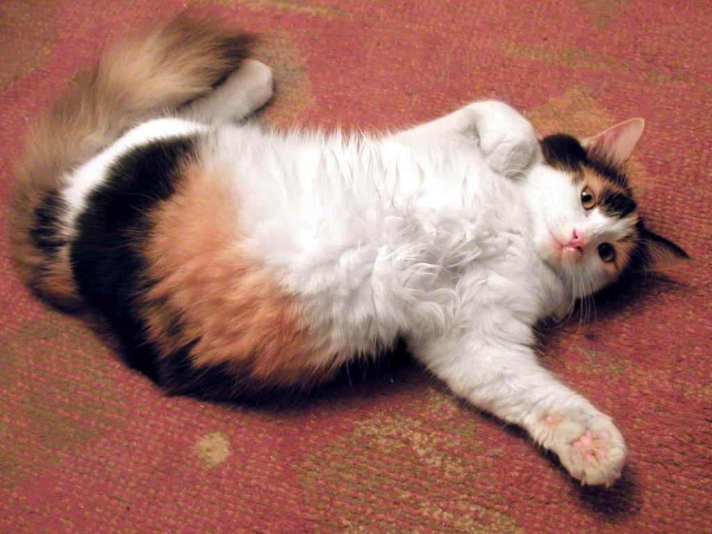 Если кошечка начинает кататься на спине по шероховатой поверхности, то она явно дает понять, что ей надо помочь прочесать шерстку, либо избавить от накожных паразитов.