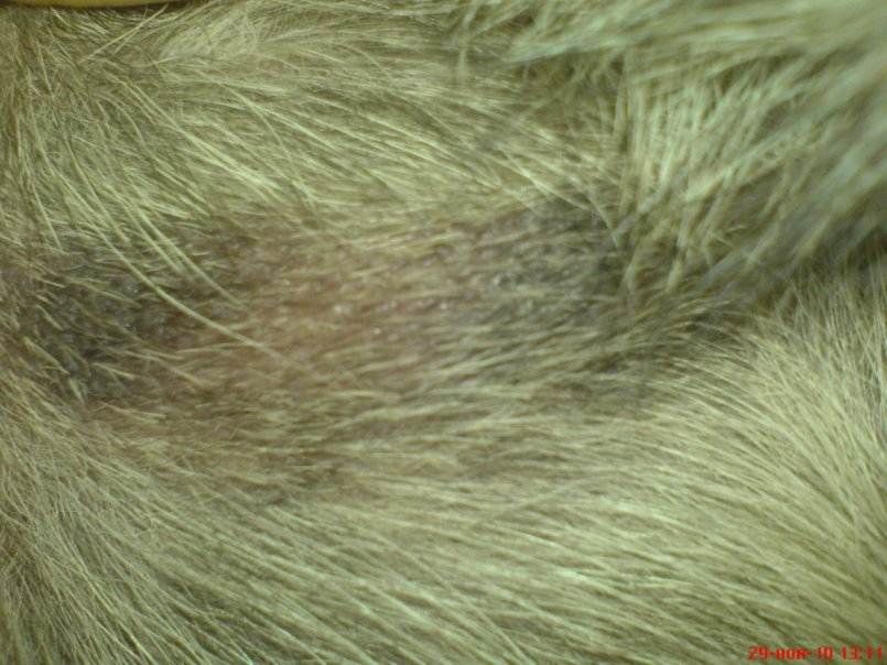 - Симметричное облысение живота, бедер, боков, передних лап – характерный симптом заболевания кожи.