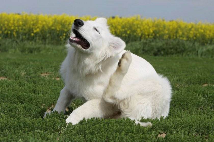 Кровососущие насекомые, выделяют токсичные вещества. Клещи, блохи, паразитируя на коже собаки, вызывают зуд, покраснение, и как следствие шелушение кожи.